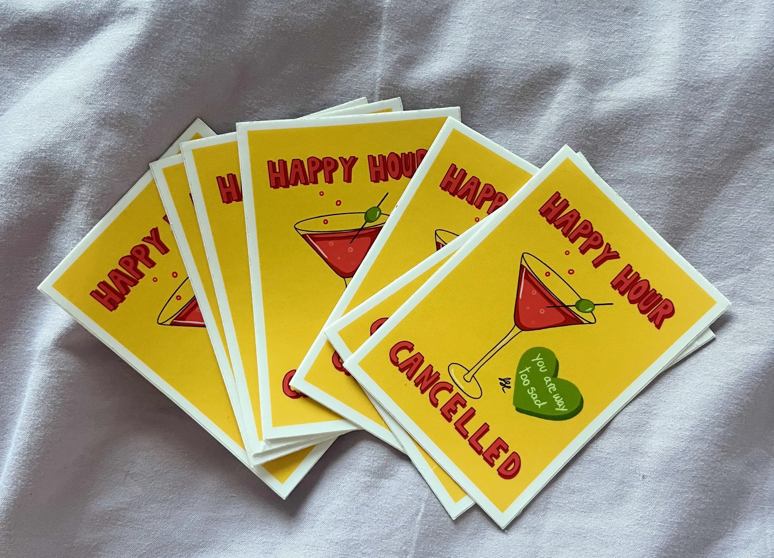 Categories: All Music Inspired Prints Stickers Stickers Happy Hour Cancelled Sticker $4.00 Oh No Don't Cry Sticker $4.00 Oh! BTW Everyone Called Sticker $4.00